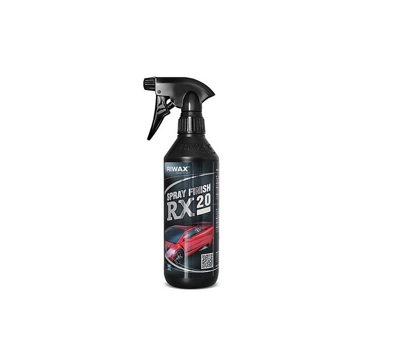 RX 20 SPRAY FINISH 500 ml. c-spruzzinoDetergente brillantante a base acqua con cere selezionate.Detergente brillantante a base acqua con cere selezionate. Dona lucentezza ed effetto scivolo a tutte le superfici verniciate nuove o lucidate. RX 20 Spray Finish si puo applicare anche su paraurti in plastica guarnizioni in gomma plexiglass vetro acrilico cristalli vetri e cromature e tanti altri materiali. Particolarmente indicato per la pulizia veloce delle superfici senza l?uso di acqua e anche utilizzabile per asportare i residui di pasta abrasiva. E applicabile a mano. Esente da silicone. Senza solventi VOC 2 0%.