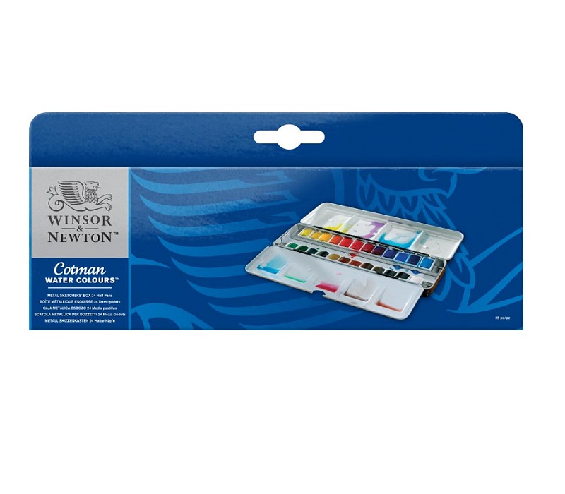 CONFEZIONE DI METALLO SKETCHERS 24 1/2 GODETRef. 0390645Scatola in metallo con 24 acquarelli 1/2 godet Cotman.Contenuto:Tavolozza bianca integrata;anello per impugnare;24 mezzi godets.Gli acquarelli Cotman sono stati sviluppati specialmente per gli artisti che richiedono acquerelli trasparenti di buona qualita ad un prezzo economico.