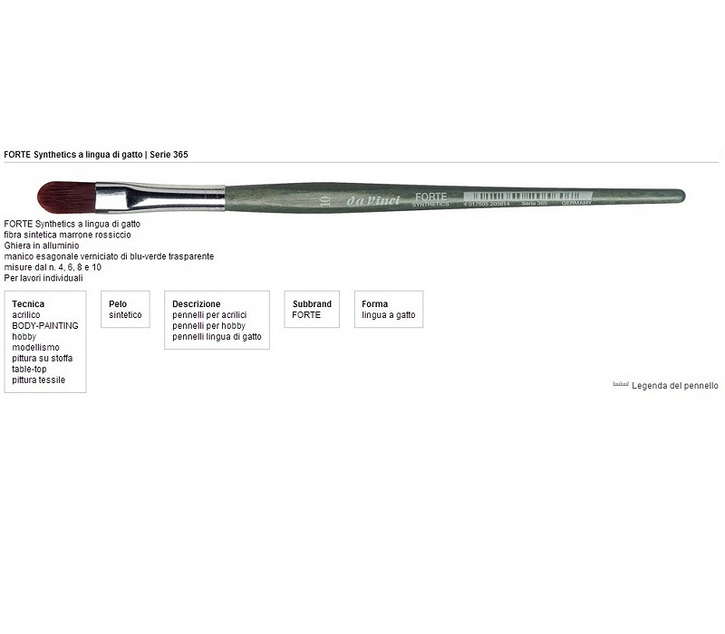 *ad eliminazione*    **6pezzi disponibili**S.365 Penn.sint.FORTE ovale n.4daVinci FORTE in fibra sintetica rosso-marrone per tecniche decorative.Questa linea e stata sviluppata particolarmente per colori di consistenza pastosa su superfici ruvide. La qualita delle fibre FORTE garantisce un tratto preciso e una punta affidabile.Una gamma perfetta per l'olio e l'acrilico e per lavorare su legno  cartone  porcellana  ceramica  ecc.