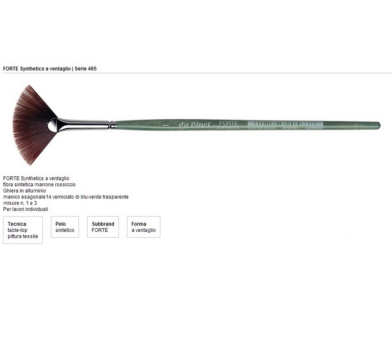 * ad esaurimento * **1pezzo disponibile**S.465 Penn.sint.FORTE ventaglio n. 3daVinci FORTE in fibra sintetica rosso-marrone per tecniche decorative.Questa linea e stata sviluppata particolarmente per colori di consistenza pastosa su superfici ruvide. La qualita delle fibre FORTE garantisce un tratto preciso e una punta affidabile.Una gamma perfetta per l'olio e l'acrilico e per lavorare su legno cartone porcellana ceramica ecc.