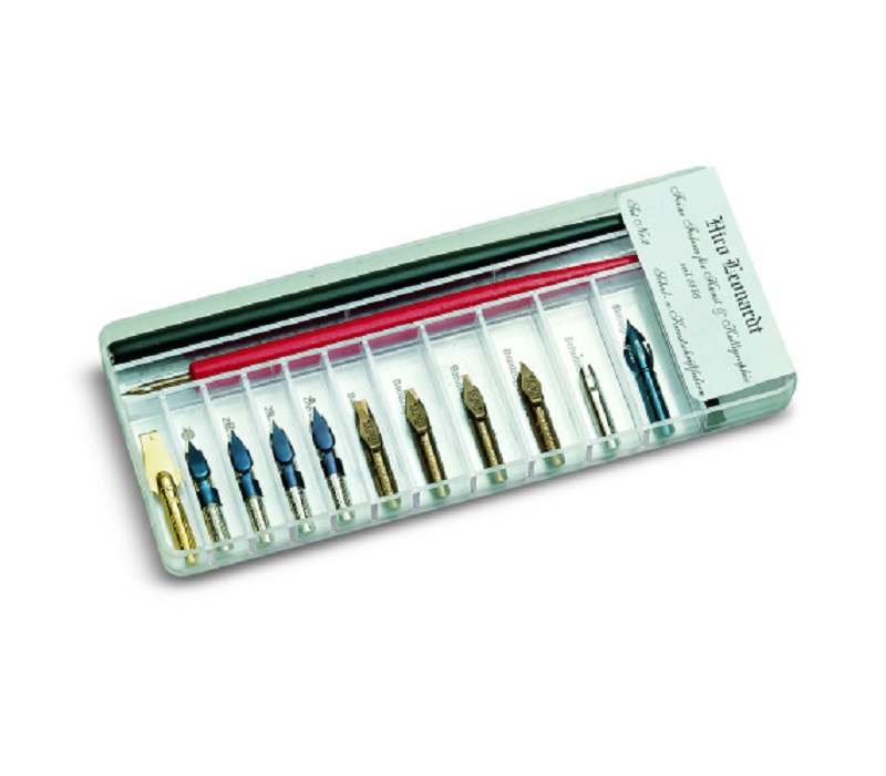 Hiro Leonardt Set di pennini scolastici e per scrittura artistica.Set n.2Set di pennini scolastici e per scrittura artistica HIRO LEONARDT in cassetta trasparente di plastica con 14 scomparti. Molto intuitiva e pratica. Etichetta in scrittura calligrafica.Contenuto 12 pennini: 1 pennino per calligrafia per ogni spessore: 1 mm 2 mm 3 mm 4 mm bronzo 1 pennino per scrittura ornamentale per ogni spessore: 1/2 mm 1 5 mm 2 5 mm 3 5 mm nichelato 1 pennino tubicino extrafine1 pennino per cartelloni 5 mm ottone 1 pennino scolastico 1/2 mm SP bronzo dorato 1 pennino per stenografia 40 blu 2 portapennino 1 magnete di sollevamento