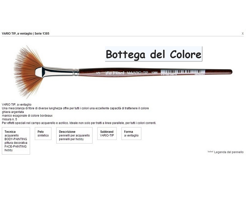 S.1385 Penn.Vario-Tip ventaglio n.5I Vario Tip sono pennelli di nuova concezione che permettono la creazione di effetti veramente speciali. La punta a ventaglio e caratterizzata dall'accoppiata di due peli diversi per lunghezza ed elasticita il piu corto e fine forma un -serbatoio- per quello piu lungo ed elastico consentendo la creazione di campiture parallele e di dipingere facilmente vegetazione e paesaggi.