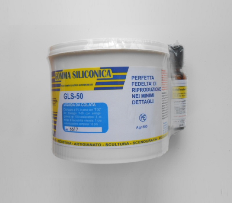 Gomma siliconica GLS-50 500gr. con catalizzatoreLa GLS-50 e una gomma siliconica liquida da usare per colata. La sua viscosita apparentemente elevata riesce pero a penetrare ovunque e a riprodurre ogni minimo dettaglio. E' adatta per costruire stampi a pozzo cioe monovalva di piccoli oggetti anche molto dettagliati e con forti sotto squadro come figurini statuine bassorilievi candele ecc.
