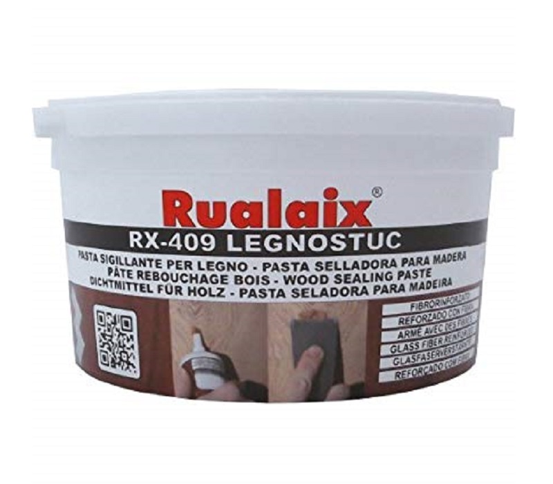 RUALAIX RX-409 LEGNOSTUCPasta sigillante per il legno indicato per riempire e riparare tutti i pori del legno prima di pitturare. Prodotto rinforzato con fibra di vetro. Uso interno ed esterno.Eccellente lavorabilita' facile da lisciare facile da cartavetrare ha un eccellente capacita? di riempimento e una buona aderenza. Lascia una pellicola superficiale di estrema durezza.