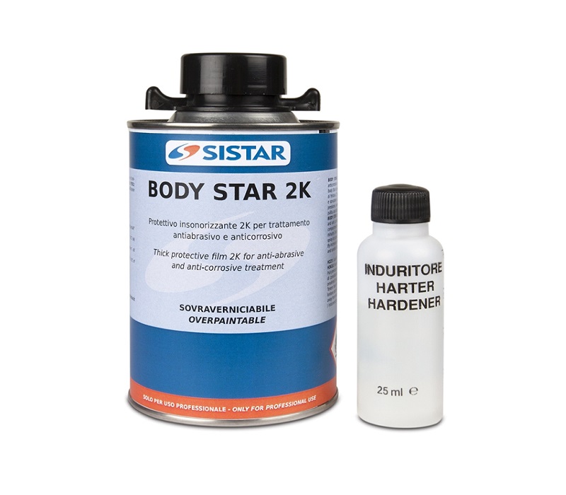 BODY-STAR 2K grigio chiaro 500 ml.Protettivo insonorizzante 2K ad elevatissimo residuo secco per il trattamento antiruggine anticorrosivo e antiabrasivo delle scocche passaruota fasce laterali interni spoiler bagagliai. Catalizzare con specifico induritore al 5% in peso e agitare bene. Si applica a spruzzo con l?apposita pistola pneumatica avvitandola direttamente sul pratico barattolo con tappo a vite. Body Star 2K e sovraverniciabile con qualunque tipo di finitura.