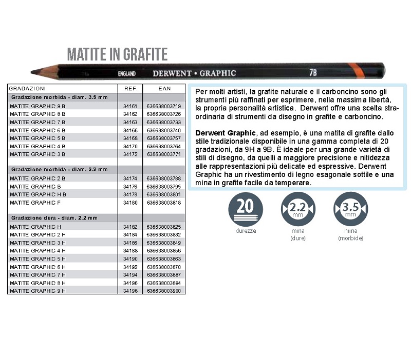 Derwent Graphic sono matite in grafite ideali per un vasto numero di stili di disegno illustrazioni precise e dettagliate con disegni morbidi ed espressivi. Le matite sono dotate di un corpo sottile esagonale e di una mina in grafite facile da temperare.20 durezze disponibili le mine morbide hanno un diametro di 3.5mm mentre le mine dure hanno un diametro di 2.2mm.
