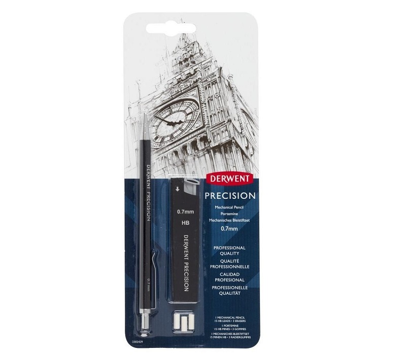 DERWENT PRECISION SET - ref. 2302429 -Matita meccanica / portamina   Ideale per gli abbozzatori e i professionisti del disegno tecnico  vanta un corpo in metallo di alta qualita che e stato progettato per una presa e un equilibrio ottimali. Disponibile in due misure ( 0 5 e 0 7 mm ). Le matite meccaniche di precisione Derwent includono una gomma incorporata sotto il cappuccio del pulsante e il pennino retrattile le rende tascabili.Questo set comprende1 portamine Precision15 ricariche HB3 gommine
