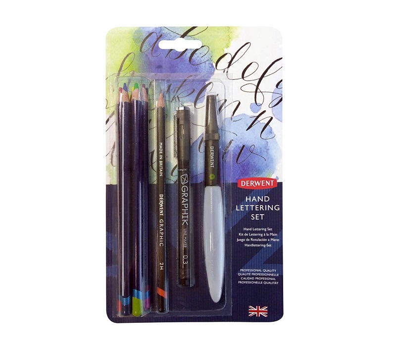HAND LETTERING SET - ref. 2305500 -*PROMO*HAND LETTERING SETCON BLOCCO A4 HAHNEMUHLE compreso (fino ad esaurimento scorte)Blister contenente5 matite Inktense1 Pennello con serbatoio Watersoluble fine1 Graphik Line marker nero da 0 31 matita Graphic 2H.Blocco per hand lettering Hahnemuhle A4 170gr. 25 fogli