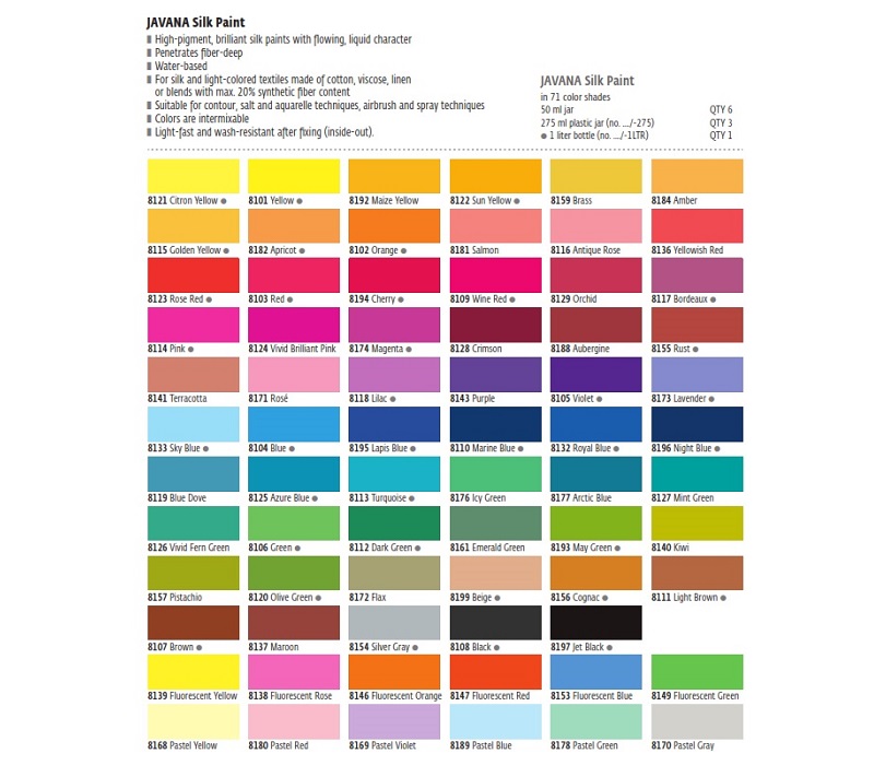Kreul Javana colori per seta.- colori per seta brillanti ricchi di pigmenti con carattere fluido / liquido- penetrano profondamente nelle fibre- a base d'acqua- per seta e tessuti chiari in cotone viscosa lino e tessuti misti (max 20% fibre sintetiche)- adatti per svariate tecniche come quelle per contorni sale acquerelli airbrush e spray- mescolabili fra di loro- dopo il fissaggio con il ferro da stiro sono resistenti alla luce e al lavaggio (a rovescio)Disponibili in formato da 50 ml 275 ml o alcuni in formato da litro.