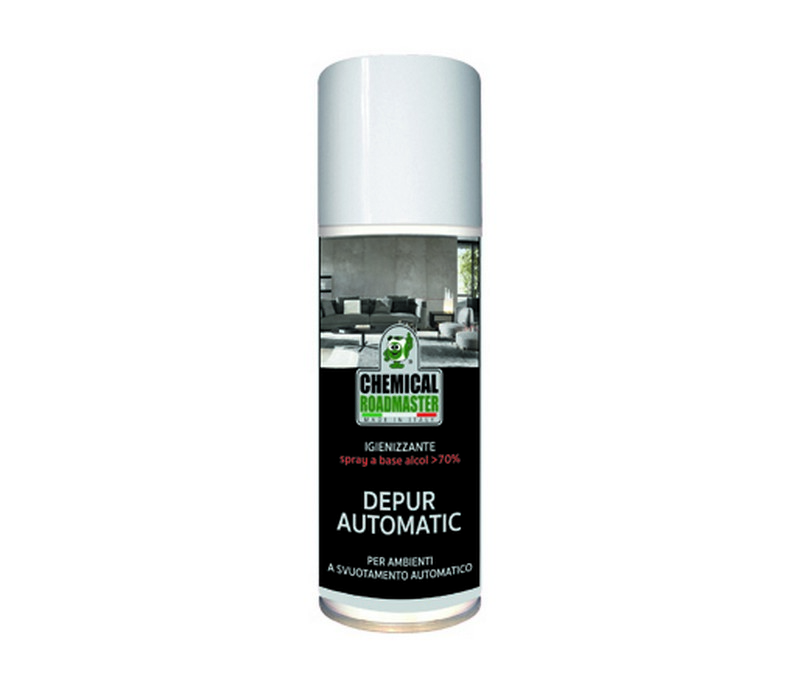 DEPUR AUTOMATIC SPRAY PER AMBIENTI DA 200ML A SVUOTAMENTO AUTOMATICO.Spray monouso a svuotamento automatico totale (One Shot) in grado di igienizzare ed eliminare gli odori presenti negli ambienti e di lasciarvi un intensa e gradevole profumazione.Grazie al suo elevato contenuto di alcol igienizza a fondo anche negli angoli piu difficili da raggiungere producendo un aerosol finissimo che satura l ambiente. Combatte inoltre efficacemente alla sorgente le maleodorazioni come sudore odore di chiuso fumo e loro combinazioni. Dopo l?applicazione evapora completamente quindi non macchia e non lascia tracce o aloni su nessun tipo di superficie. Di uso sicuro non contiene prodotti nocivi e tossici idrocarburi pesanti o solventi aromatici o clorurati.