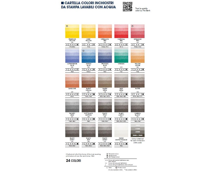 CHARBONNELInchiostro da stampa linoleografia e taglio dolce composto da oli emulsionati idrosolubili LAVABILI CON ACQUA per tecniche di incisione in cavo e in rilievo.Caratteristiche:- A base di olii emulsionati idrosolubili (non contengono acqua).- Lavaggio delle mani e degli attrezzi con acqua insaponata.- Concentrazione pigmentaria elevata.- Ottima resistenza alla luce.- Colori miscibili fra loro.- Buona aderenza e facile asciugatura.- Utilizzo su carta meno umida rispetto agli inchiostri tradizionali non stemperabili una volta asciutti.