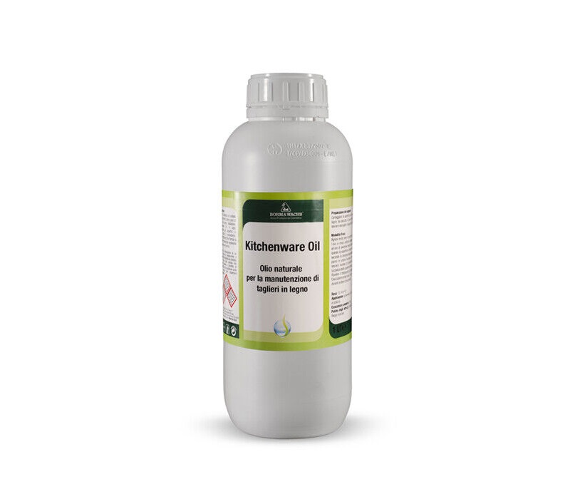 KITCHENWARE OIL BORMA 1L...Olio naturale per la manutenzione di taglieri in legno...Olio esente da VOC realizzato con sostanze di origine naturale ideale per il trattamento di legno grezzo o precedentemente trattato ad olio destinato a venire in costante contatto con gli alimenti come piani di tavoli da cucina insalatiere ecc. Resa: 12 - 14 mq/Lt Uso: Interno. Rende la superficie repellente all'acqua e allo sporco. Certificato in conformita' alla normativa EN71-III garantendone la sicurezza in merito al rilascio di sostanze nocive.