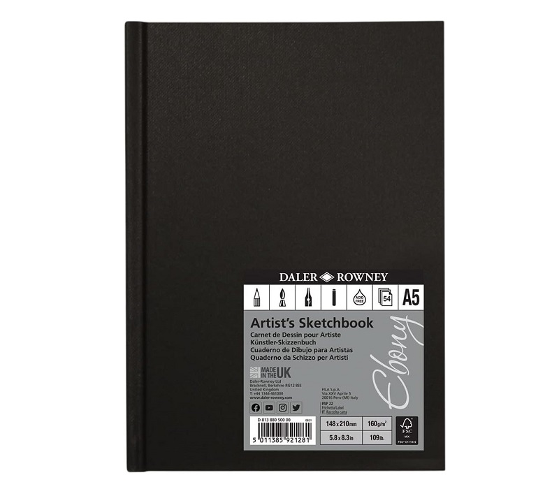 DALER ROWNEY EBONY. Quaderno da schizzi per artisti.Carta extra bianca 160 grammi ideali per matita carboncino penna inchiostro acquerello leggero e tecniche miste le pagine prive di acidi e certificate FSC (FSC-C111372) mantengono la loro tonalita naturale nel tempo.Copertina rigida.Formato A5 ritratto (rilegatura sul lato lungo)