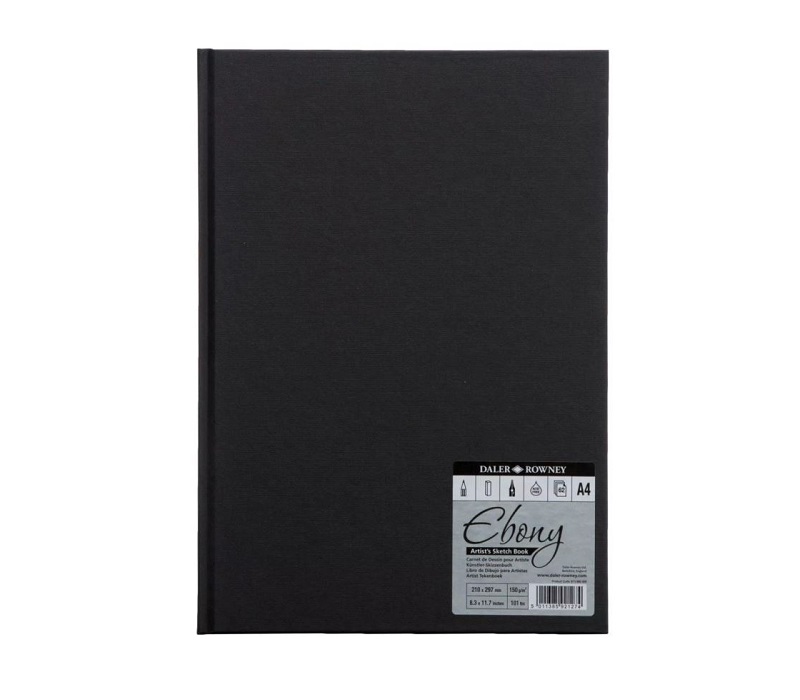 DALER ROWNEY EBONY. Quaderno da schizzi per artisti.Carta extra bianca 160 grammi ideali per matita carboncino penna inchiostro acquerello leggero e tecniche miste le pagine prive di acidi e certificate FSC (FSC-C111372) mantengono la loro tonalita naturale nel tempo.Copertina rigida.Formato A4 ritratto (rilegatura sul lato lungo)